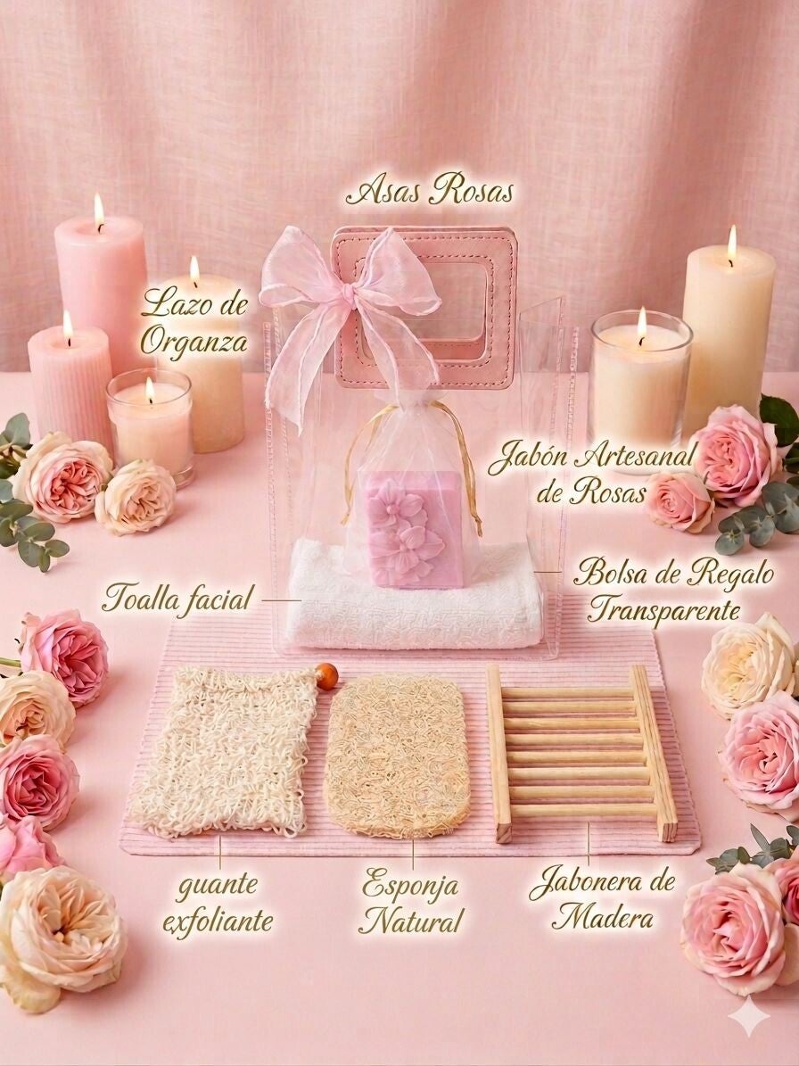 Set listo para regalar. Incluye un jabón hidratante base de leche de cabra, aceites y fragancias naturales extraídas de los pétalos de las rosas. Jabonera, guante exfoliador, esponja natural y toalla facial todo dentro de una hermosa bolsa especial para el dia de las madres. Edición limitada.